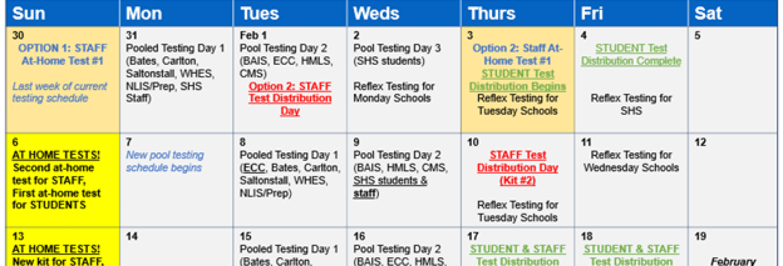 2. Instructions: At home tests are to be used by students and staff on Sunday evenings or Monday mornings before returning to school. If winter interferes with tomorrow’s planned distribution, kits will go home Monday and can be used Monday night.